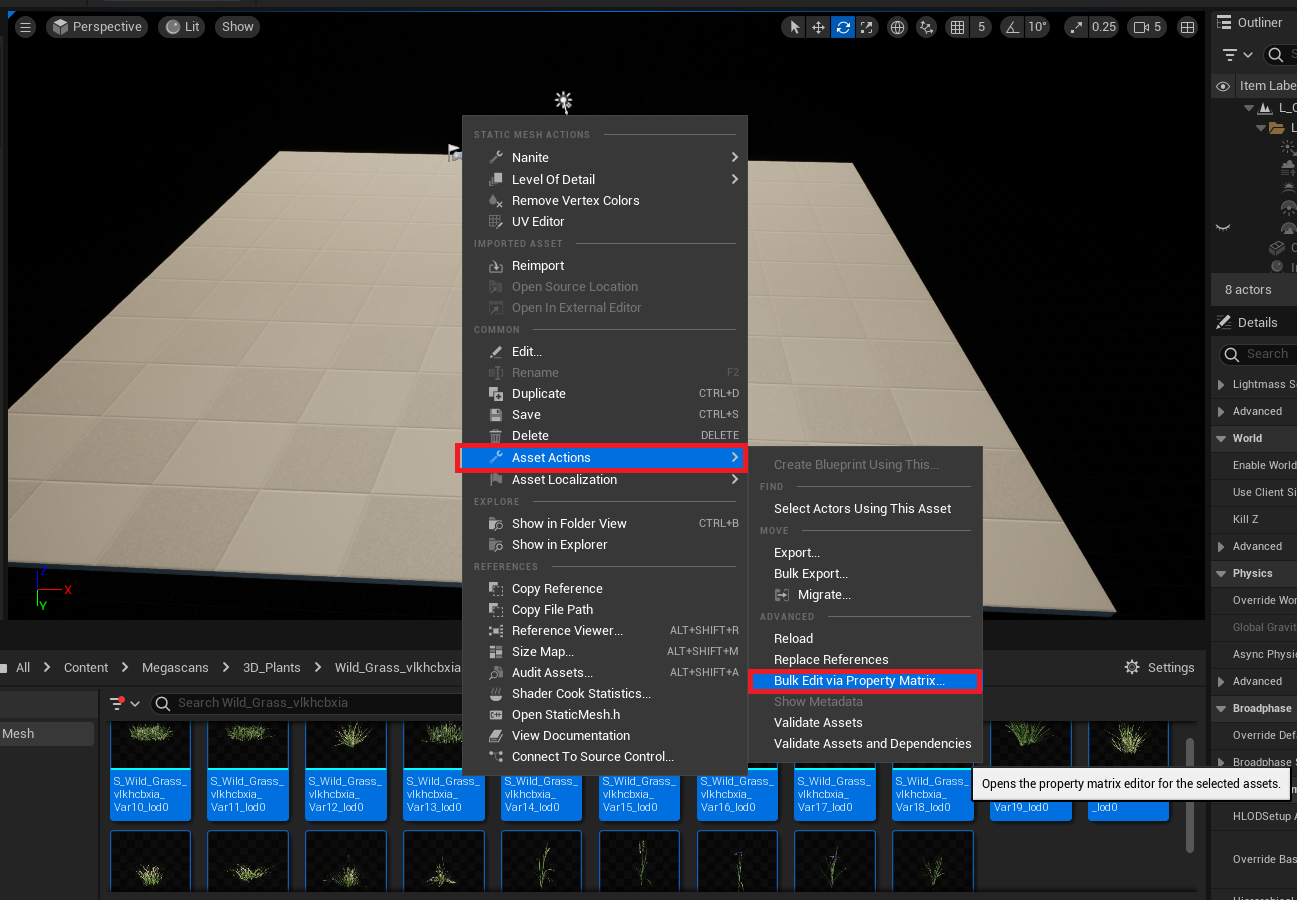 ๋ชจ๋ ์คํํฑ ๋ฉ์๋ฅผ Ctrl + A๋ฅผ ๋๋ฌ ์ ํํด ์ค๋๋ค. ๊ทธ๋ฐ ๋ค์ Asset Actions - Bulk Edit via Property Martrix๋ฅผ ์ ํํด ์ฃผ์ธ์. ์ฌ๊ธฐ์ Bulk Edit ์ "๋๋ ํธ์ง"์ ์๋ฏธํฉ๋๋ค.