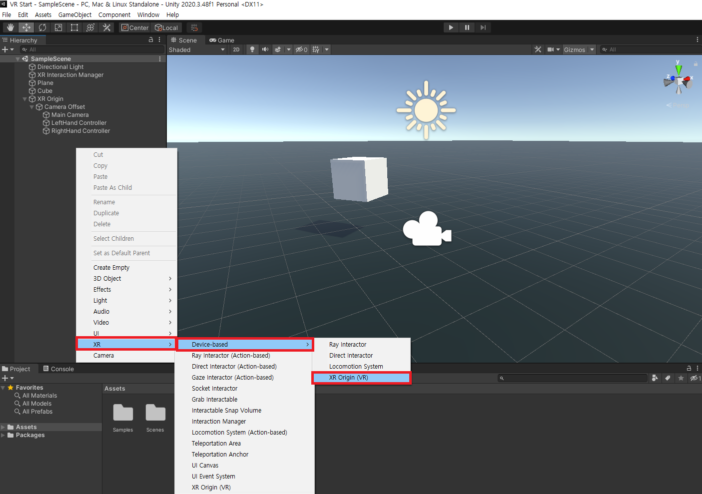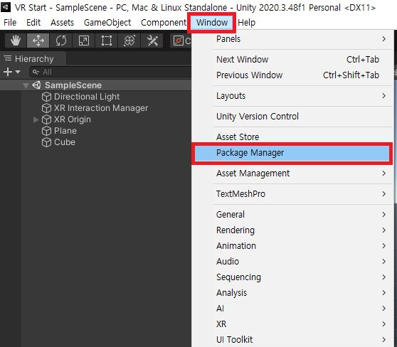 Hierachy ์ฐฝ์ ์ฐํด๋ฆญ ํ XR - Device - based - XR Origin (VR) ์์๋ก ์ ํํฉ๋๋ค.
