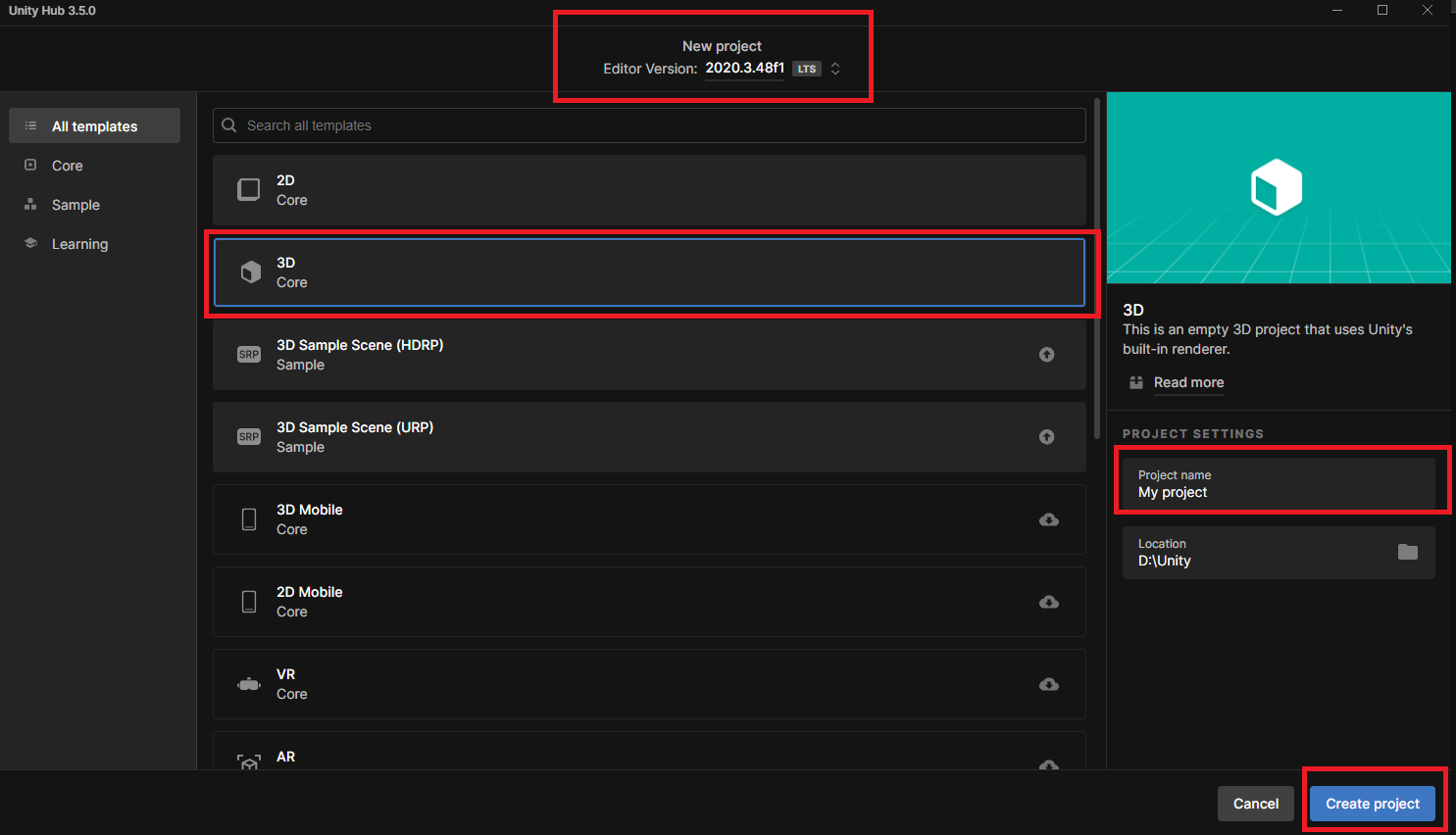 Unity Hub์ ์คํ์ํจ ํ ์์๋๋ก ํ์ฌ ์์ง ๋ฒ์ ํ์ธ / 3D ํ ํ๋ฆฟ / ํ๋ก์ ํธ ์ด๋ฆ ์ง์ ํ Create ํด์ค๋๋ค.