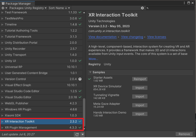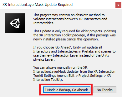 XR Interaction Toolkit ์ค์น ์ ๋ํ๋๋ ๊ฒฝ๊ณ ์ฐฝ์ ๋๋ค. ์ ์ฌ์ง์ฒ๋ผ ์ ํ ํ Unity๋ฅผ ์ฌ ์์ํ๊ฒ ๋ฉ๋๋ค.