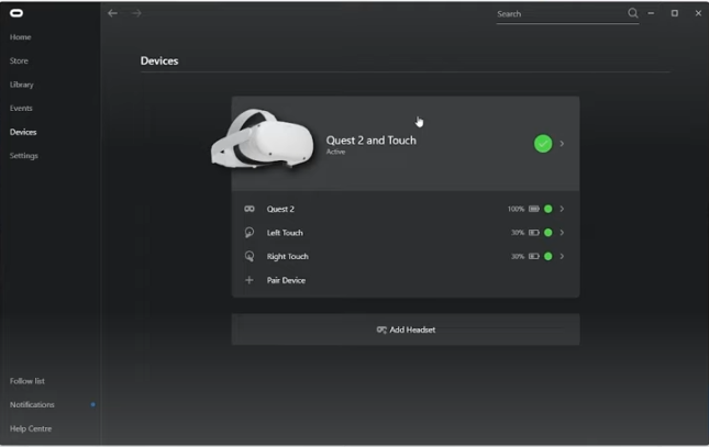Oculus ์ํํธ์จ์ด๋ฅผ ์คํ์์ผ Quest 2 ์ฅ์น๊ฐ ํ์ฑํ ๋์ด ์๋์ง ํ์ธํด ์ฃผ์ธ์.