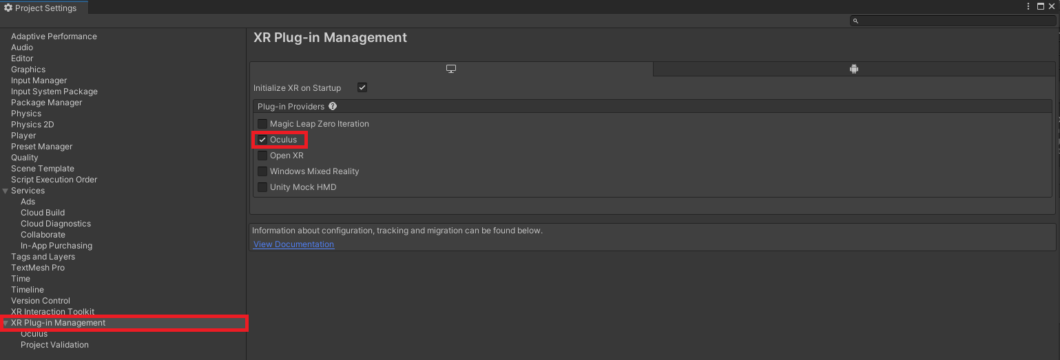 Project Settings ์ ํ ํ XR Plug-in Management - Oculus ์ฒดํฌํด ์ค๋๋ค.