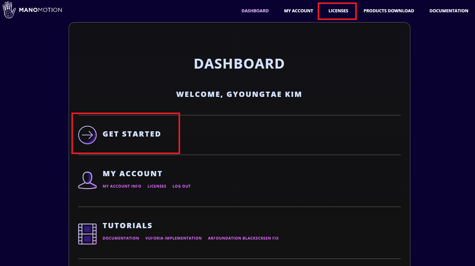 ํ์๊ฐ์ ์ ๋ํ๋๋ ์ฐฝ์ ๋๋ค. ์ฃผ๋ชฉํด์ผ ํ๋ ๊ฑด ๋นจ๊ฐ์ ๋ค๋ชจ๋ก ๊ทธ๋ ค์ง Get Started / ๋ผ์ด์ผ์ค๊ฐ ์์ต๋๋ค.