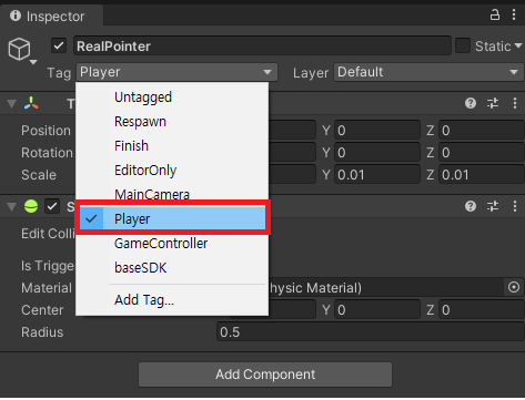 GrabInteraction ํด๋์ค์์ handPointer๋ก ์ง์ ํ ์ค๋ธ์ ํธ Tag๋ฅผ Player๋ก ๋ณ๊ฒฝํฉ๋๋ค.