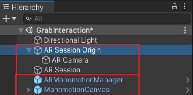 AR ํ๊ฒฝ์ ์ํด AR Session Origin๊ณผ AR Session์ ์์ฑํด ์ค๋๋ค. ๊ทธ๋ฆฌ๊ณ ARManomotionManager ๊ณผ ManomotionCanvas Prefab์ ์์ฑํด ์ค๋๋ค. SDK๋ฅผ ๋ค์ด๋ฐ์ผ์ จ๋ค๋ฉด ๊ฒ์์ฐฝ์ ๋ฐ๋ก ์ฐพ์ผ์ค ์ ์์ต๋๋ค.