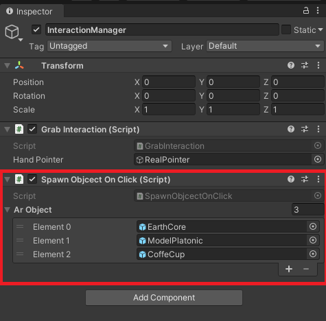 GrabInteraction ์ปดํฌ๋ํธ๋ฅผ ๋ฃ์ด์ฃผ๊ณ , Hand Pointer๋ก ์ฌ์ฉํ ์ค๋ธ์ ํธ๋ฅผ ๋ฃ์ด์ค๋๋ค.