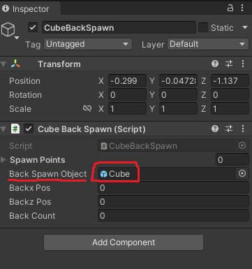 ๋ง์ฐฌ๊ฐ์ง๋ก CubeBackSpawn ๋น ์ค๋ธ์ ํธ๋ฅผ ๋ง๋ค์ด์ฃผ๊ณ , ์ด ์ค๋ธ์ ํธ๋ ํ๋ ์ด์ด์ ๋ค์ ์์นํ๊ฒ ๋๋ค.