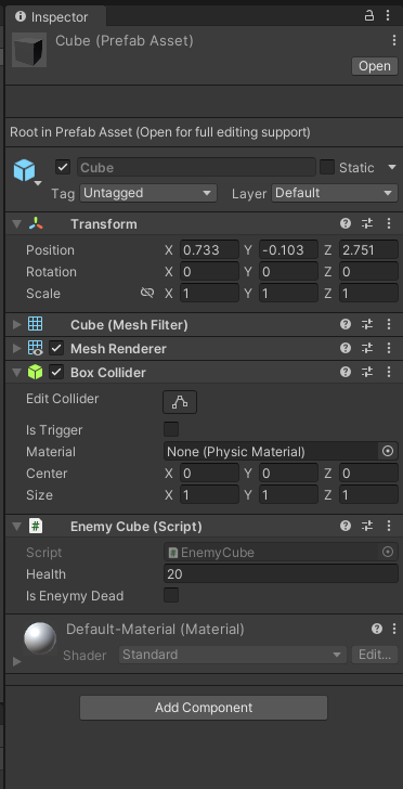 Prefab์ผ๋ก ๋ง๋ค์ด์ง Cube์ ๋ํ ์ ๋ณด์ด๋ค. Add Component๋ฅผ ํด๋ฆญํ์ฌ Box Collider๋ฅผ ๋ง๋ค์ด์ฃผ์. ๋ง๋ค์ด์ฃผ์ง ์์ผ๋ฉด ์ถฉ๋ ๊ฐ์ง๊ฐ ๋ฐ์ํ์ง ์์ ์ฐ๋ฆฌ๊ฐ ์ ์๊ฒ ์ด์ ์์ ๋ ์๋ฌด๋ฐ ์ผ์ด ์ผ์ด๋์ง ์๋ ํ์์ ๊ฒช๊ฒ ๋๋ค.