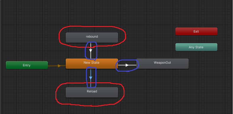 ์ ์ฌ์ง์ New State -> Reload๋ก ๋ชจ์ ๋์์ ํ๊ณ ์์ต๋๋ค. New State๋ ์ด์ ์ฅ๊ณ ๊ฐ๋งํ ์๋ ์ํ, Reload๋ ์ฌ์ฅ์ ๋์์ ๋๋ค. ์ฌ๊ธฐ์ ์ค์ํ ๊ฒ์ Conditions์ ๋๋ค. ์กฐ๊ธ ์ ์ Triger ํ์ ์ผ๋ก ๋ง๋ ํ๋ผ๋ฏธํฐ Reload๋ฅผ Conditions์ผ๋ก ์ถ๊ฐํด์ค ๋ค ์คํ๋ ๋ ์ ์ฌ์ง์ ๋ชจ์ ๋ณํ๊ฐ ์ด๋ฃจ์ด์ง๊ฒ ๋ฉ๋๋ค.