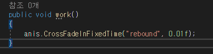 ๋ค์์ ์ด์ ๋ฐ๋ ๋ชจ์ ์ ํ๊ธฐ ์ํด CrossFadeInFixedTime()๋ฅผ ํธ์ถํด rebound ๋ผ๋ ์ด์ ๋ฐ๋ ๋์ ์ํ ํ 0.01์ด ๊ฐ๊ฒฉ์ผ๋ก ๋ค์ ๋์์ ์ํํ๊ฒ ๋ง๋ค์ด์ฃผ์์ต๋๋ค.
