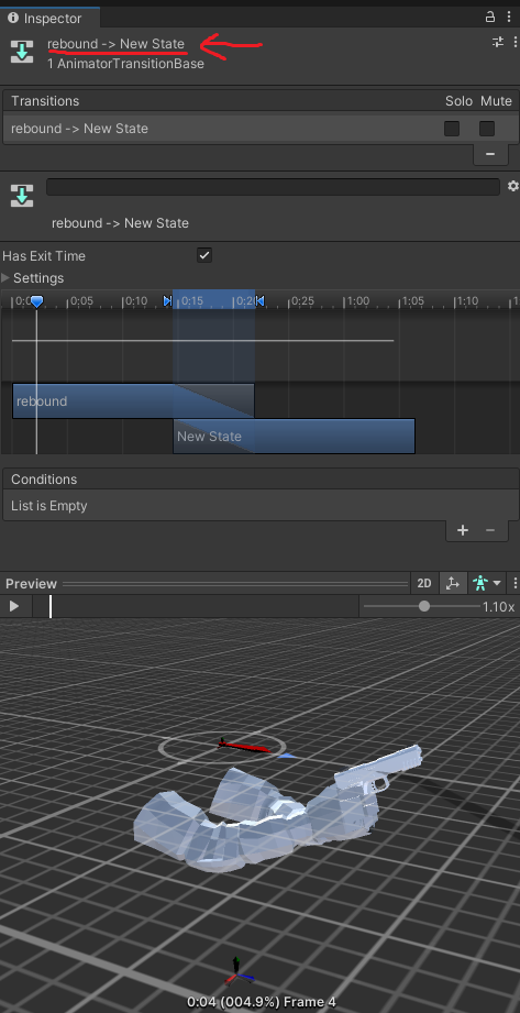 rebound (์ด ๋ฐ๋) ์ํ ํ New State(์ด์ ๊ฐ์ง๊ณ ๋๊ธฐ ์ํ)๋ก ์ ํํ๊ณ ์์ต๋๋ค. ์ฆ, CrossFadeInFixedTime() ํธ์ถํ์ฌ 0,01์ด ๊ฐ๊ฒฉ์ผ๋ก ๋ชจ์ ๋ณํ์ ํ๊ฒ ๋๋ ๊ฒ๋๋ค.