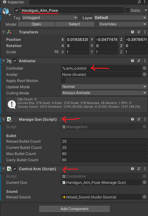 ์ด์ ๋ง๋ค์๋ ์ ๋๋ฉ์ด์ ๊ณผ ํ์ํ ์ปดํฌ๋ํธ๋ฅผ ๋ฃ์ด์ค ๋ชจ์ต์ ๋๋ค. Handgun_Aim_Pose ์ค๋ธ์ ํธ๋ ํ๋ ์ด์ด์ ํ ์ ๋๋ค. ์ฌ์ฅ์ ์ ๋ด๋นํ๋ ์ปดํฌ๋ํธ๋ฅผ ์ด์ ๋ฃ์ด์ผ ํ ์ง, ํ๋ ์ด์ด์ ํ์ ๋ฃ์ด์ค์ผ ํ ์ง ๊ณ ๋ฏผํ์๋๋ฐ, ์๋ฌด๋๋ ํ์ฐฝ์ ์๋ก ๋ฐ๊ฟ ๋๋ ํ์ ๊ฐ์ ์ด ๋ ํฌ๋ค๊ณ ์๊ฐ๋ผ ํ๋ ์ด์ด์ ํ ์ค๋ธ์ ํธ์ธ Handgun_Aim_Pose์ ๋ฃ์ด์ฃผ๊ฒ ๋์์ต๋๋ค.