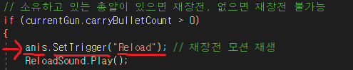 anis.SetTrigger("Reload"); // ์ฌ์ฅ์ ๋ชจ์